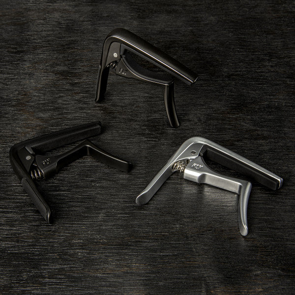 Dunlop does it again. Trigger Fly is a new generation of Trigger Capos where precision, handling and durability have been the focus. Dunlop has designed a solid construction that is easy to use and does not affect the tone and playability no matter where on the neck you place the capo. Improved rubber material has been used for accurate intonation and longer durability. The Trigger Fly Capo builds on Dunlop's most popular capo design with better handling and tuning stability than ever. The grip is more comfortable and ergonomic. A specially designed spring mechanism provides a more balanced pressure for easy placement and accurate intonation up and down the neck - even as high as the 7th fret on most acoustic guitars. Chords and single notes will ring out with even clarity and sustain. A new era of capos has begun and all guitarists out there can now sit back and enjoy better tone and sustain as far as the neck goes. Precise intonationThe tension mechanism provides precise, even tension and stability.Modern ErgonomicsComfortable grip and balanced tension for easy handling.Optimized Fret PadImproved rubber material adapts the grip better to the neck and maintains sustain and tone.Custom SpringCustom spring for precise pressure on the strings and long durability.